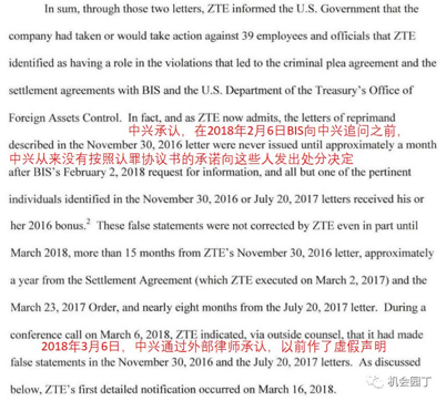 2018年4月,BIS指称中兴没有执行自己在认罪协议作出这些承诺