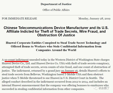 美国一个刑事初审团向联邦法院提交了对华为的十项指控,