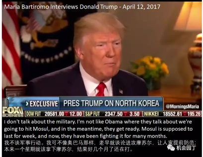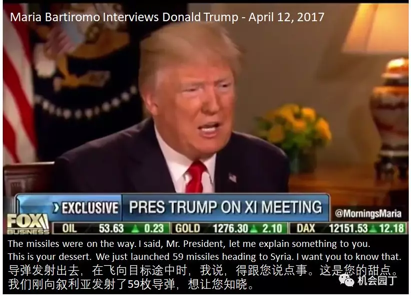 导弹发射五天后,特朗普在2017年4月12日接受FOX BUSINESS频道的专访时,绘声绘色地讲述当时的情景。