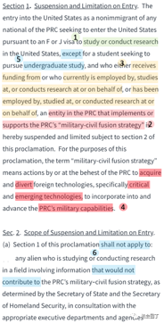 在美国 1 学习或研究的学生或学者,如果和 2 所述的实体有 3 所列的某种关联,会被限制。 2 这样的实体受限制,是要防止 4 的发生。