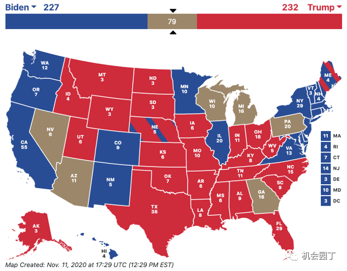 民主党的拜登会赢得加州等19个州和首都,共227票;