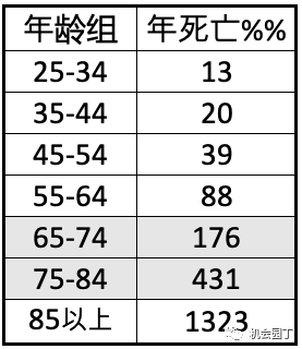根据前文《华人在美国的安全风险到底有多大?》引用的美国疾病防控中心CDC统计的死亡率,这位“打全了两针疫苗且对新冠颇有研究的传染病专家“本来每年的死亡风险至少2%(下表阴影区万分之176-431,73岁就至少万分之200,78岁大概在万分之300)