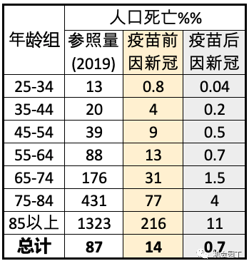 总体来说,接种疫苗后,仍因新冠而增加的致死风险为万分之0.7,是2019年万分之87的死亡风险的0.8%。趋于正常波动范围。(接种后各年龄组仍因新冠而增加的致死风险大都在2019年这个基准的1%。)