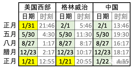以下是将来12个月中有重大农历节日的初一当地日期。黄色的日期与中国东八区不一致。